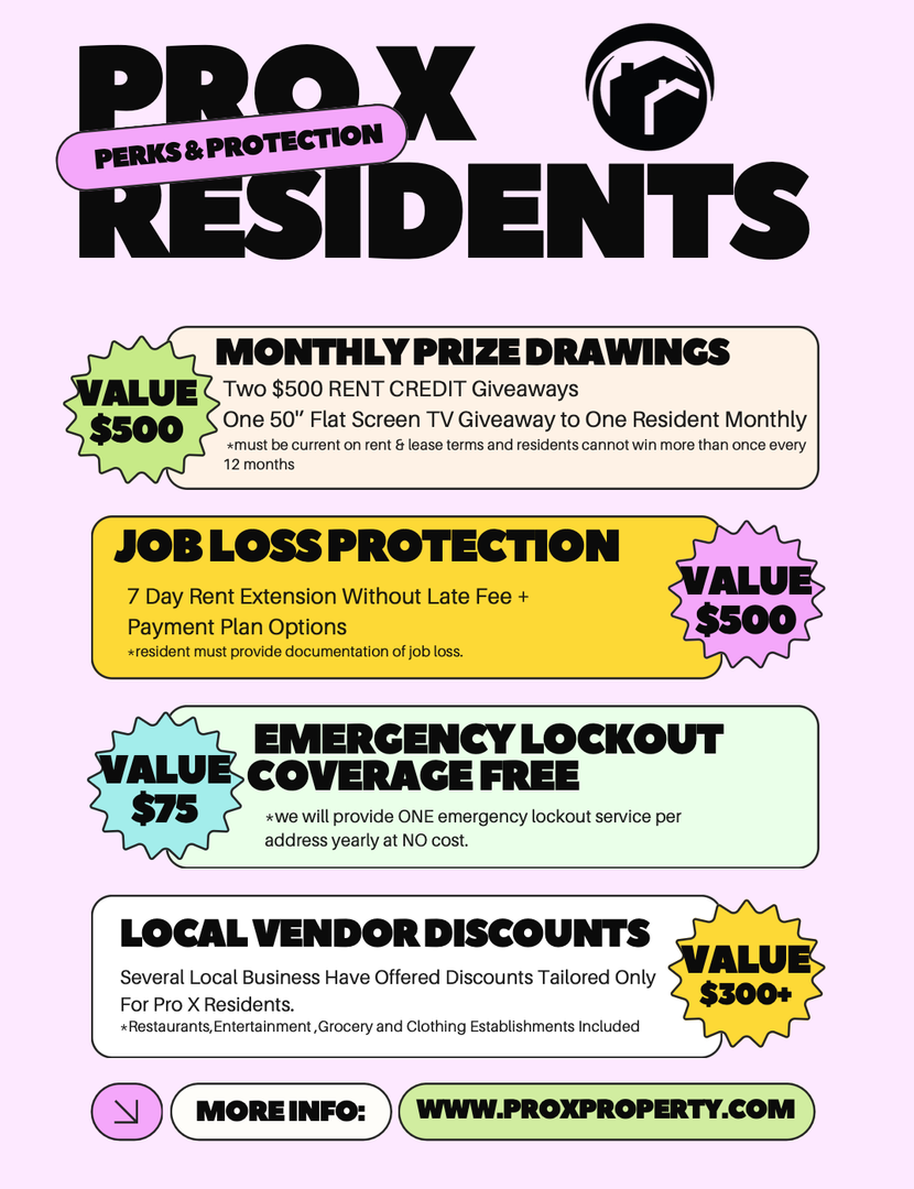 All Pro X Property Management residents are enrolled in the Resident Benefits Package (RBP) for $40.00/month which includes renters insurance, HVAC air filter delivery (for applicable properties), credit building to help boost your credit score with timely rent payments, $1M Identity Protection, our best-in-class resident rewards program, and much more! Renter’s insurance is a requirement to rent from Pro X.